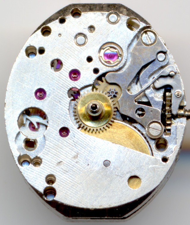 Escape wheel, seconds whee and minute wheel are beared below the lower gear train bridge, the minute wheel has got a ruby bearing only here and not on the dial side.