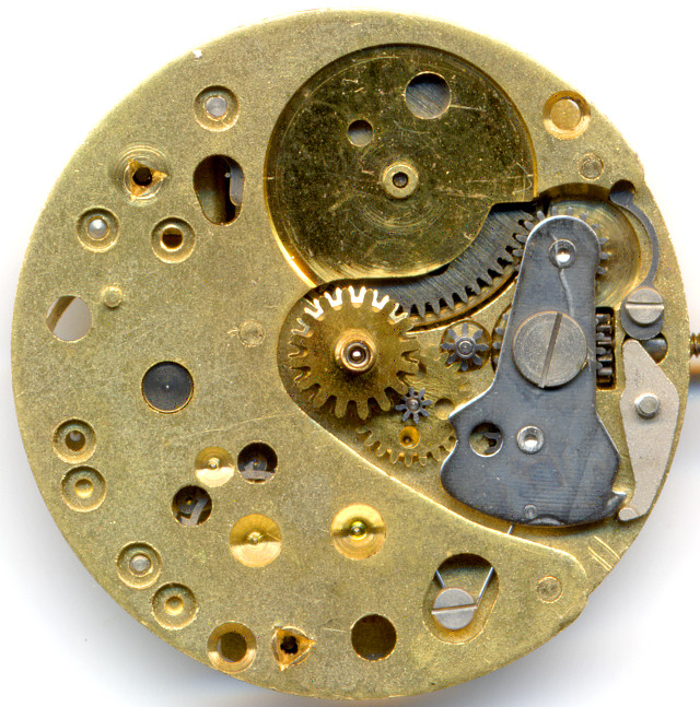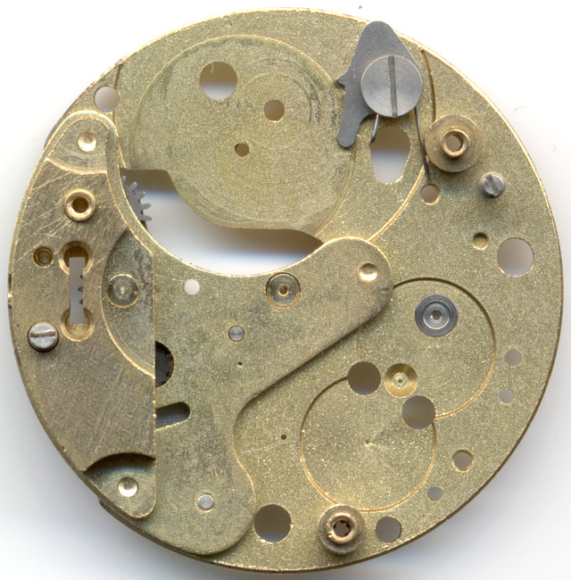 On the base plate of the pillar construction, you can already imagine, that it’s a jewel-less pin lever movement. Like on (almost) all Kienzle movements, the click mechanism is mounted on the base plate.