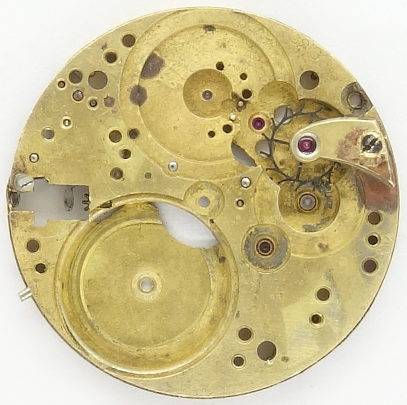 It is pretty odd, that the ratchet is located on the inner side of the mainspring barrel bridge. Since the movement came in bad condition into the archive, it is not sure, that the shown construction of the ratchet is correct.