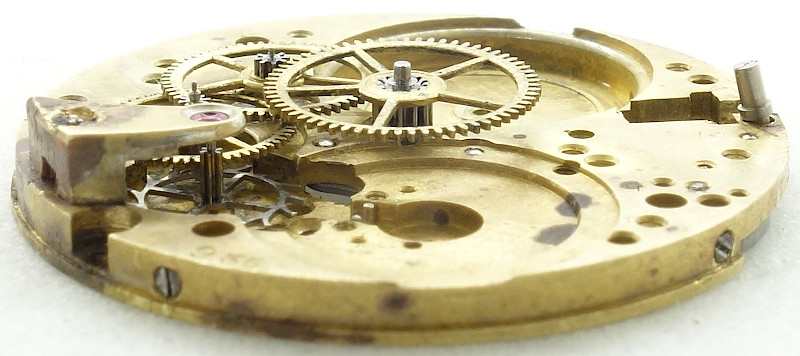The gear train is standard with a directly driven center minute wheel, followed by third wheel, seconds wheel (which could carry a decentral seconds hand at 9 o’clock, but not on the specimen shown here) and finally the steel escape wheel.