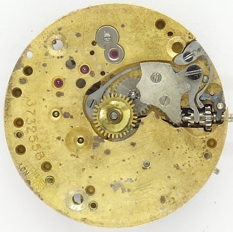 On the dial side, you see the yoke keyless works, which uses two springs. The setting lever, which points against a pin on the plate is a pleasure to see and shows, how well Longines movements were at that time.
