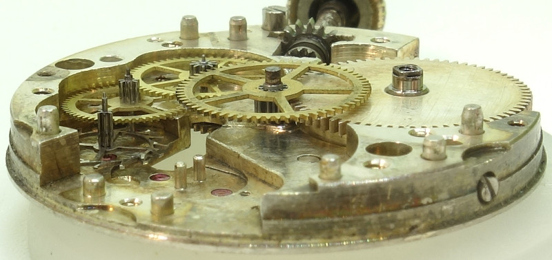 Yoke winding system (unfortunately with a broken setting lever spring on this specimen) and a partial minute dial for adjusting purposes can be seen, too.