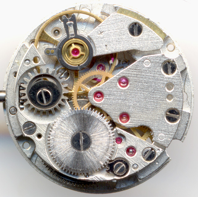 The selfwinding mechanism is implemented as a freewheel changer, so the ball-beared oscillating weight is connected to changging gears, which are equipped with a handful of flat inner discs which engage in one direction and decouple in the other direction. This principle was particularly famous for the “gyrotron” movements of Girard-Perregaux, but was also used on Russian movements such as the Vostok 2416.
