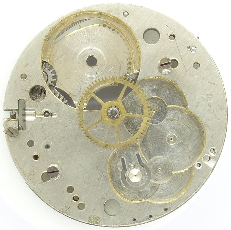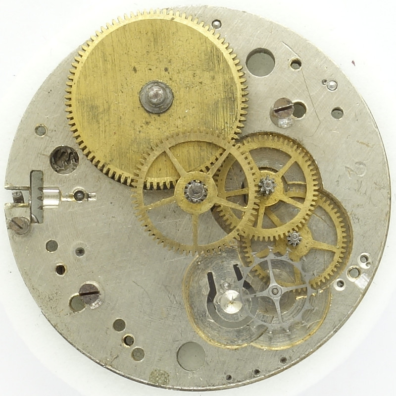 The gear train is the standard of simple cylinder movements: The mainspring barrel directly drives the center minute wheel, followed by third and forth wheel (no possibility for showing indirect seconds) and finally the individually beared cylinder wheel.