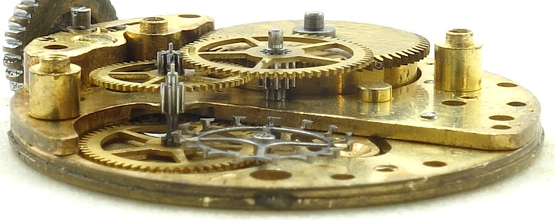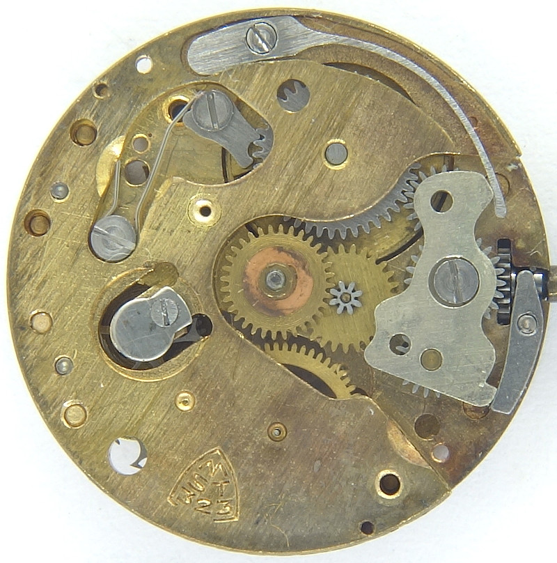 Of course, the flat anular balance is not shock protected. On the visible side (on the movement side), its axle is beared in a ruby bearing with cap jewel, but on the base plate, it only has got a metal bushing with a steel cover. It is easy to understand, that you cannot expect good timing results with such a construction.