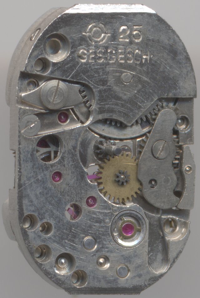 The Otero 25 (Dugena also called it Dugena 818) is a common ladies’ watch form movement from germany. It is equipped with a screw balance, which runs in a Trishock-like protection system and contains a long regulator arm. On the dial side, there’s a rocking bar winding mechanism.