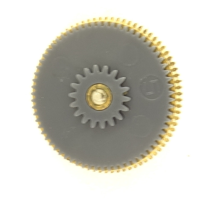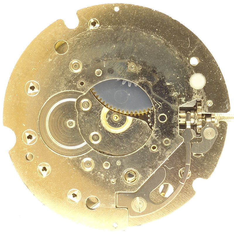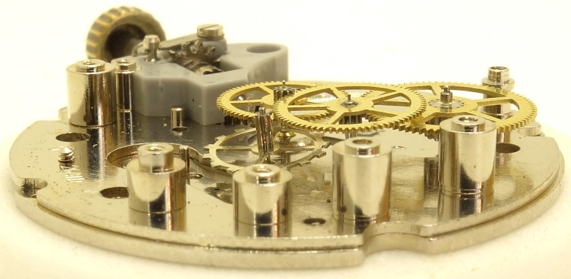 On the empty dial side, you can see, where the cannon pinion will engage with the large mainspring barrel wheel. The settings wheel also engages with the barrel wheel.