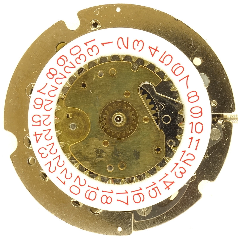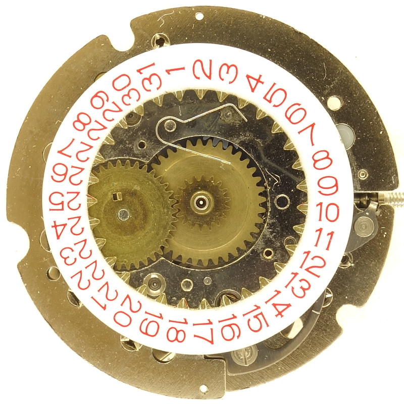 The Parrenin 2641D has got a simple calender mechanism on which the finger of the date switching wheel is just stamped out and bended. Nevertheless, this mechanism already offers a semi-fast correction by turning the hands back to 8pm and advancing to midnight.