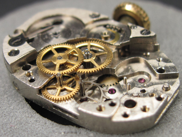The main plate shows the typical construction of a tiny ladies’ watch form movement. All important bearings, except minute wheel and mainspring barrel are equipped with rubies. A noteable detail of the Peseux 120 is, that balance, wheel, lever and escapement wheel are on one line.
