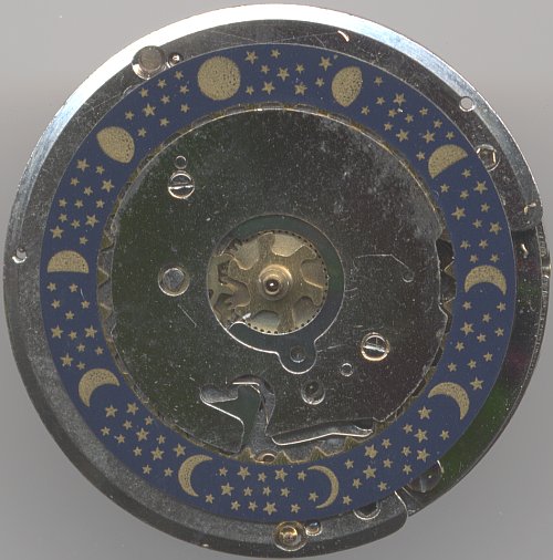 The caliber E355 is a simple pin lever movement with just one jewel and no shock protection. The only speciality is the false moon phase indication: Instead of the date numbers, the date ring was printed with ten different moon phases. Theoretically a nice idea, but with a major fault: A full moon phase takes 28.5 days, while one full rotation of the date ring takes 31 days.