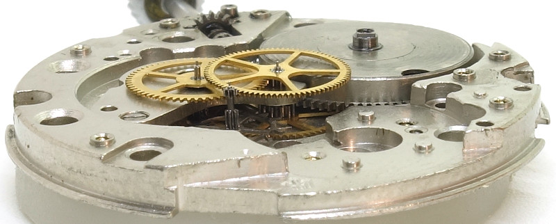 The selfwinding module is mounted on top of the gear train bridge, which has the required recessings.