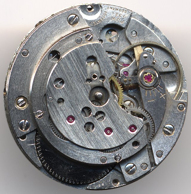 It’s not sure, that on the specimen shown here, the balance and balance cock are original, since there’s no moveable hairspring stud, only a two-leg balance and there are two different types of shock protection systems used: KIF Trior on the cock and KIF Satellor on the plate. So, maybe, the balance and the balance cock are replacement parts, which originate from the 1260ies series.