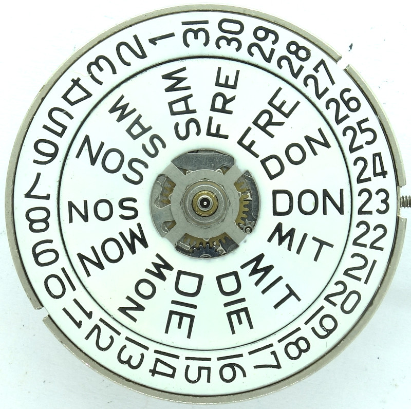 The 8-point switching star left on the image slowly advances the weekday. It is driven by the switching wheel at position 7 o’clock, like the the instantly changing date.
