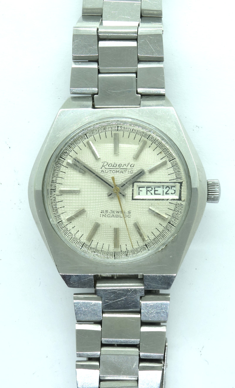 It offeres an instant switching date indication, a slowly advancing weekday indication and a quickset mechanism for the date by pushing the crown.