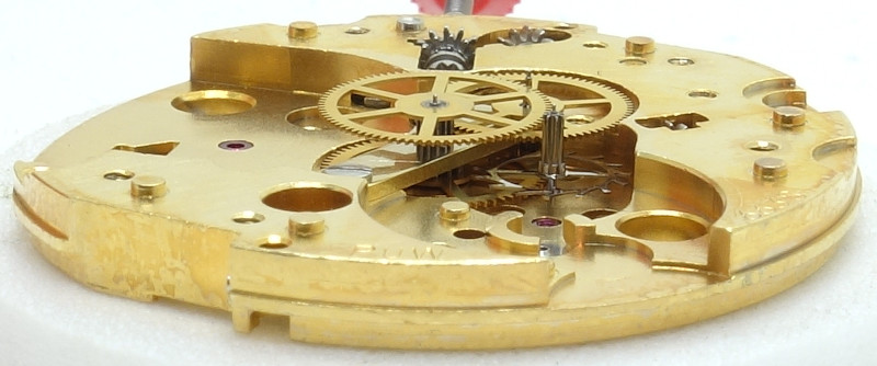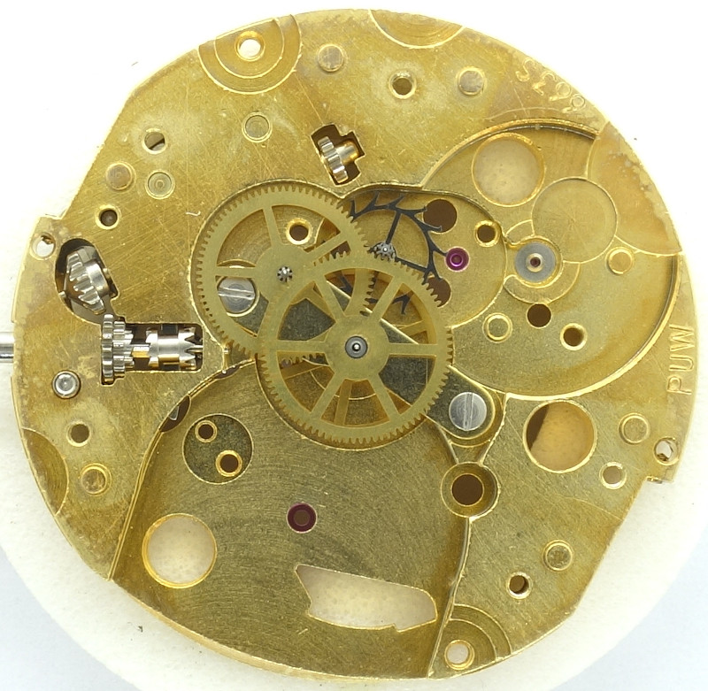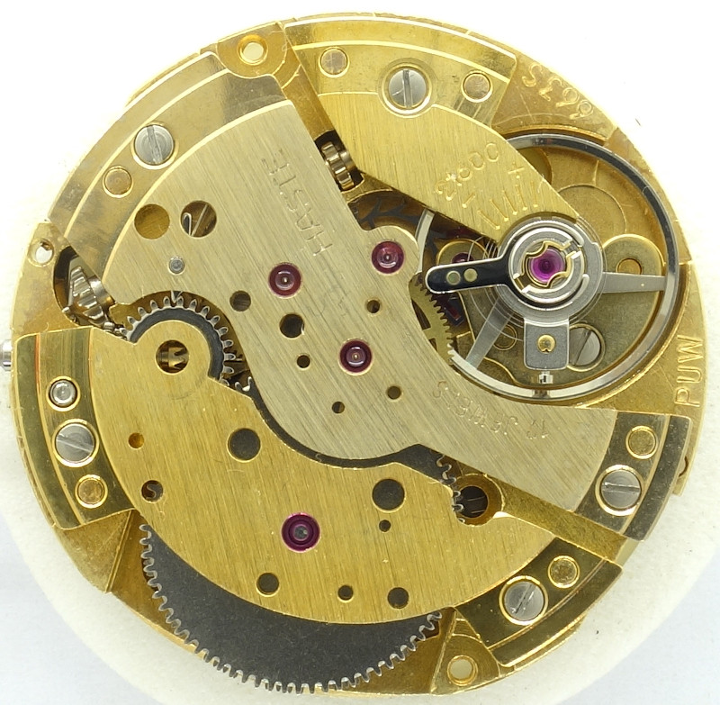 As all predecessors, the PUW 663S too, uses the classical gear train, with directly driven center minute wheel, which is beared under its own bridge. This bridge carries a bearing ruby, so that the minute wheel is ruby-beared on at least one side.