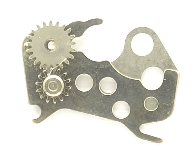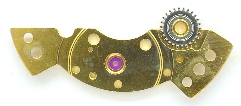 It has a lever and a pin, which are preloaded in corresponding cut-outs on the plate on the dial side, and discharge immediately at midnight. The long lever engages with the weekday disc, the pin into the date ring.