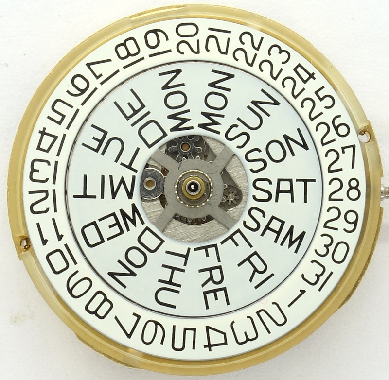 The lower side of the weekday disc has got the required toothing. It is held in position with a snap ring on the hour pinion.