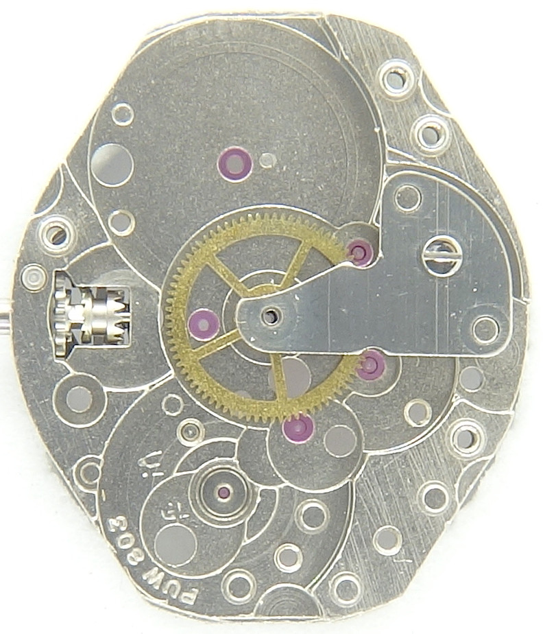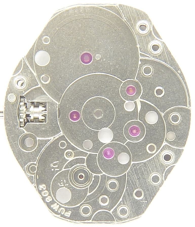 The PUW 803 uses a screw less anular balance with three legs, which is beared in two RUFA Antishock protection bearings. It beats with 21600 A/h and can be adjusted at the hairspring key only. As escapement, a traditional swiss pallet lever escapement is used.