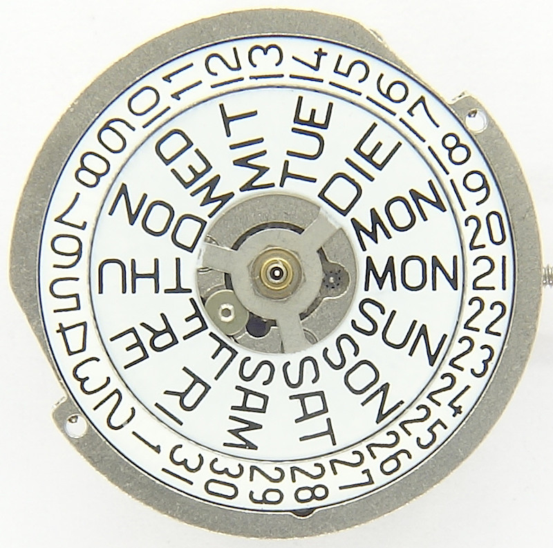 For a secure mounting of the calendar mechanism parts, they are covered with a deck plate. It also has got an attached spring with a flatround plate, which locks the weekday disc.