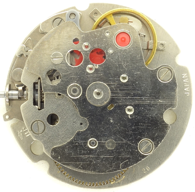 Of course, there are no jewels at all in this movement. The read colors of the lever and escape wheel bearings are the red colors of the plastic axles.