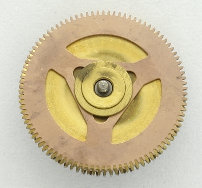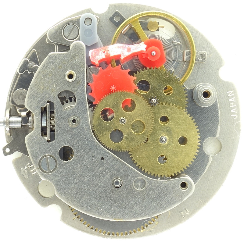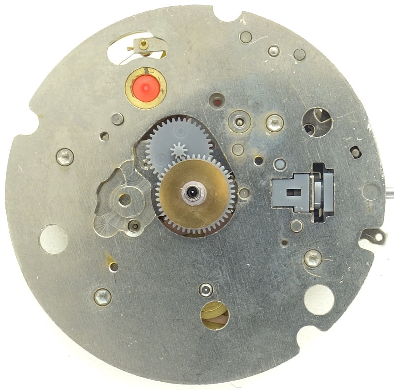 As on cheap quartz movements, the wheels on the dial side are mostly made of plastic.