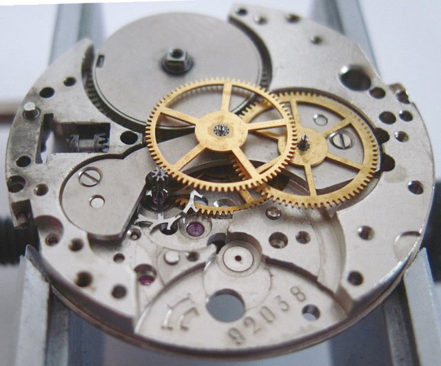 At “2:00”, there’s a yoke for the date correcting mechanism. Each time you pull the crown beyond the first position, the date advances one day.
