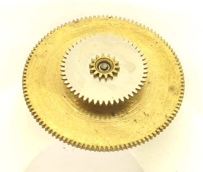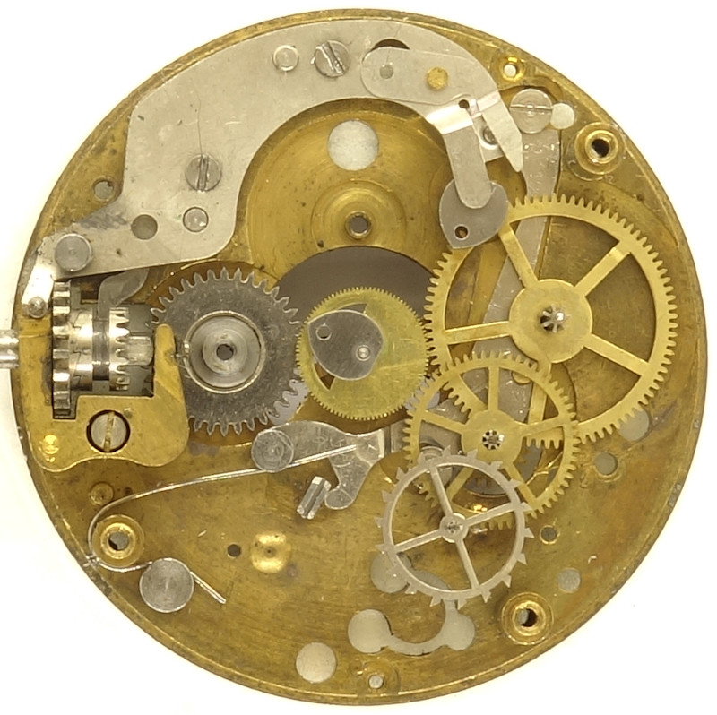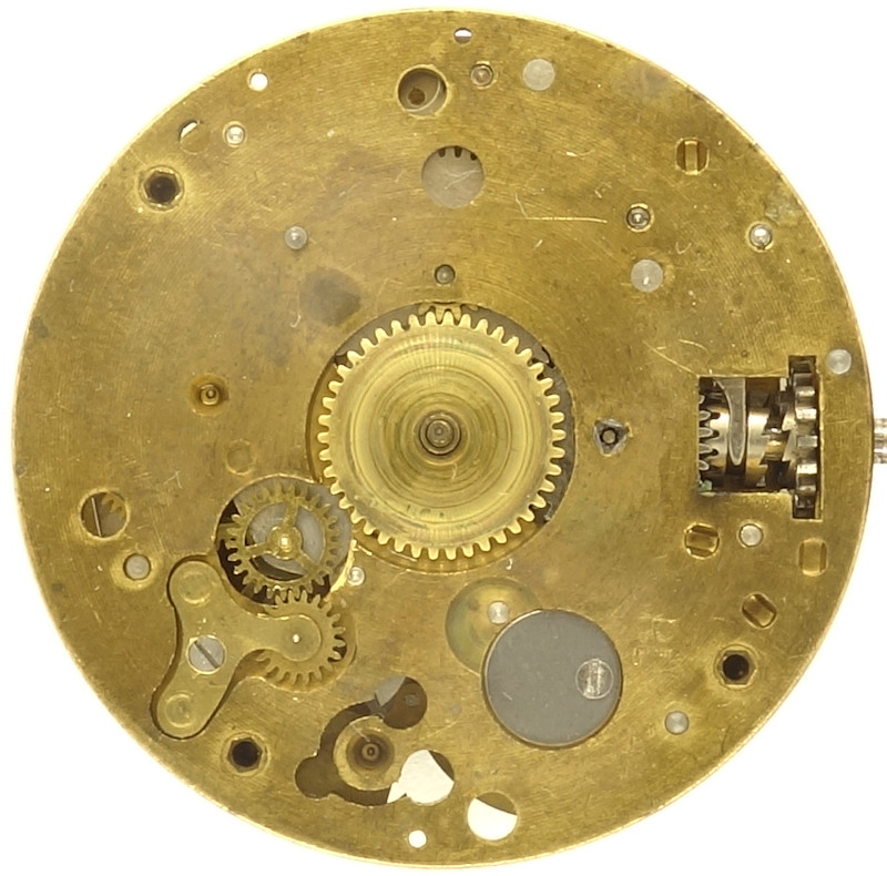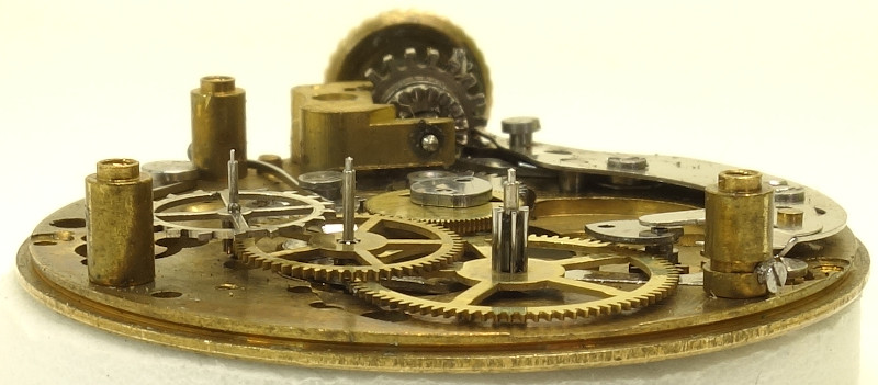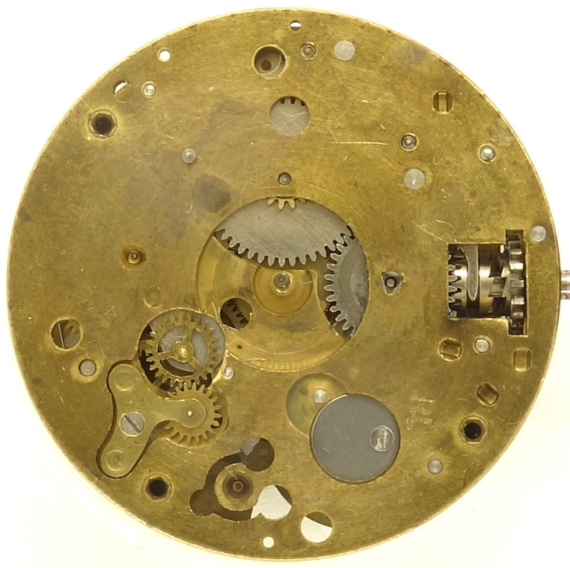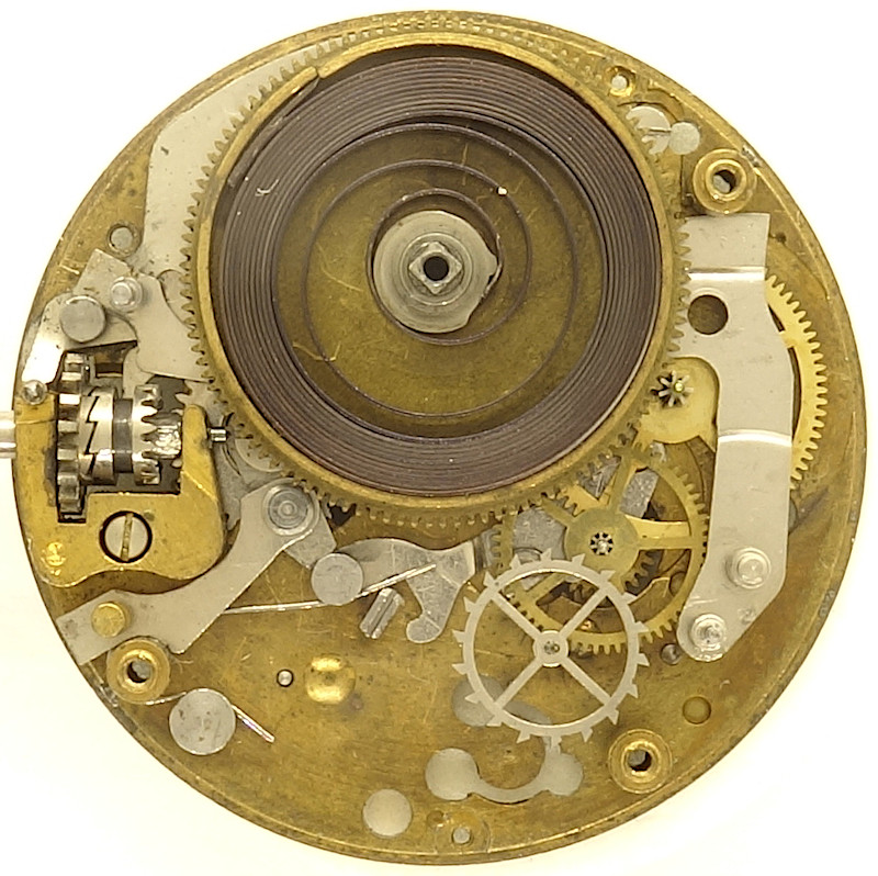 Except the stopwatch mechanism, the gear train is the common one for a Roskopf movement: The mainspring barrel drives the very large second wheel, followed by the third wheel and finally the steel escape wheel with 18 teeth.
