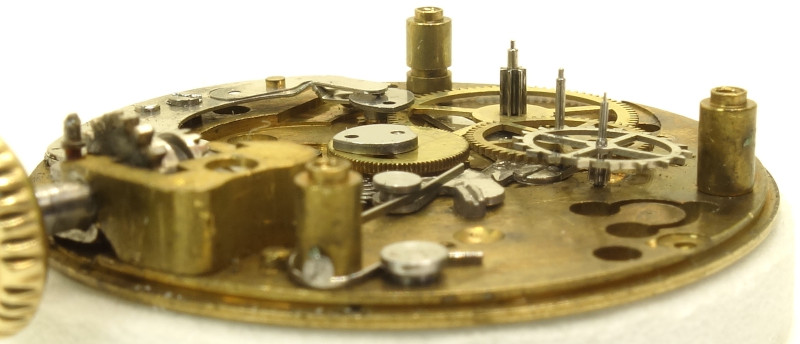 When the stopwatch works, this construction leads to a funny situation, that when you adjust the time on the Rego 147, the stopwatch minute hand will also be corrected, since both, the time indicator hands and the stopwatch minute hand are driven from the same clutch on the mainspring barrel.
