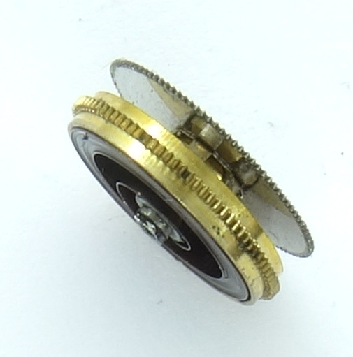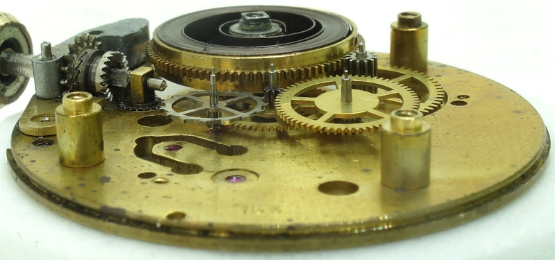 Like every Roskopf movement, the mainspring barrel contains the double hand-driving gear on its upper side, attached with a slipping clutch.