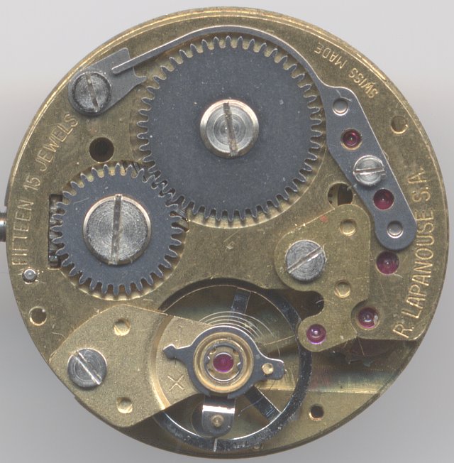 Rego / Lapanouse was always a manufactory for simple pin lever movements. It is astonishing to see the high quality of the caliber 311, where all gears are beared in synthetic rubies, and the balance runs in two rare Palierfix shock protections. Even the hairspring contains a moveable stud and a regulator arm, and under the dial, you don’t find the expected rocker mechanism, but a much better yoke keyless works.