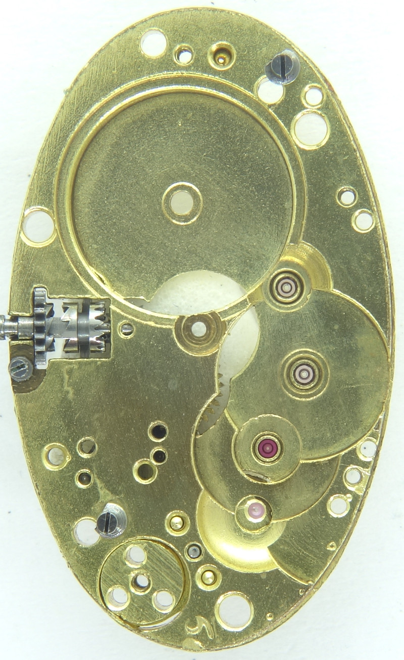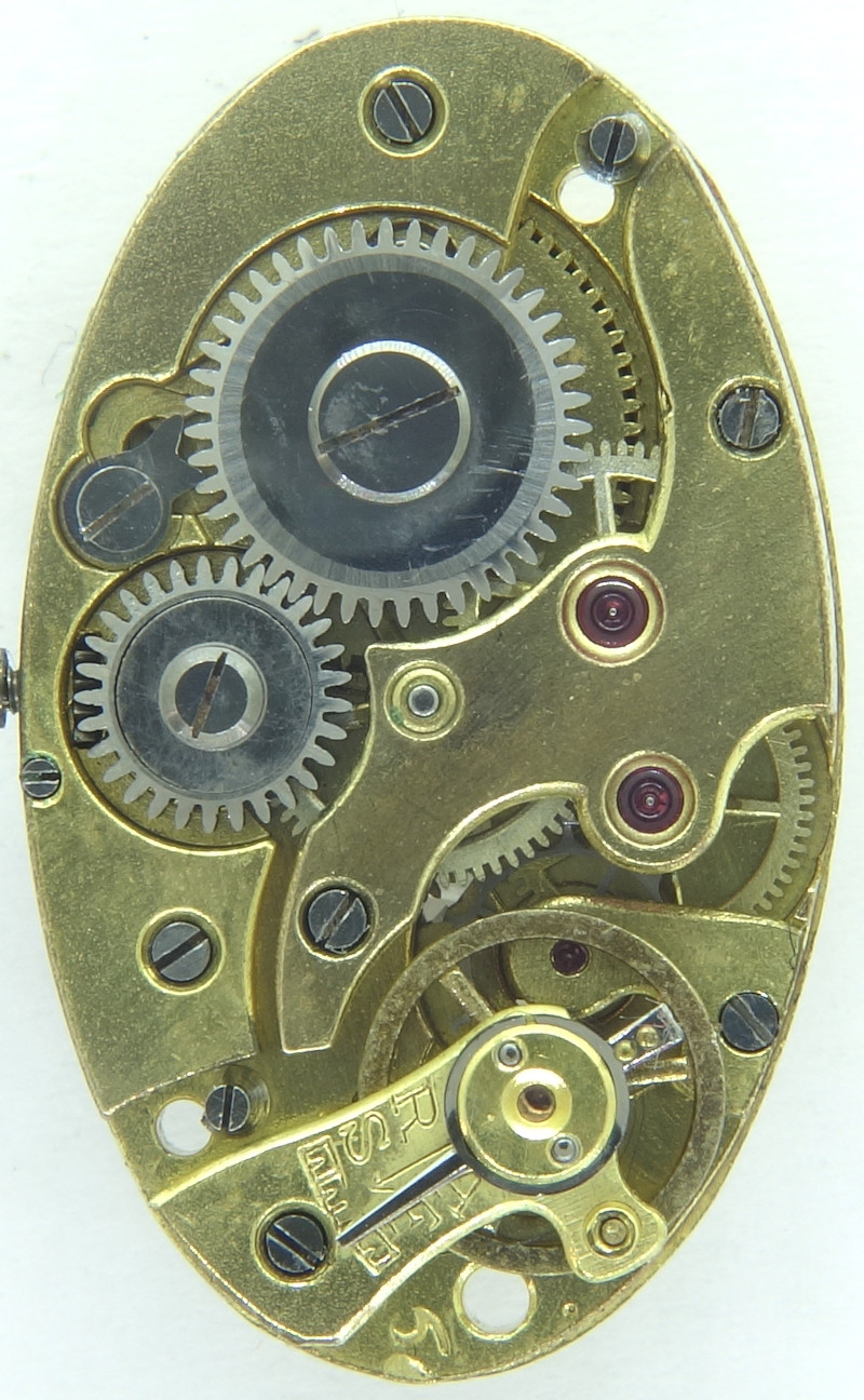 Besides that, it uses the common four wheels, directly driven center minute wheel, third wheel, seconds wheel and cylinder wheel. The latter is beared under its own cock.