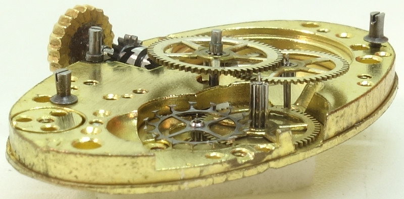 The gear train is typical for cylinder movements, but has the oddity, that the third wheel resides above the minute wheel.