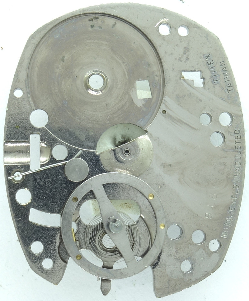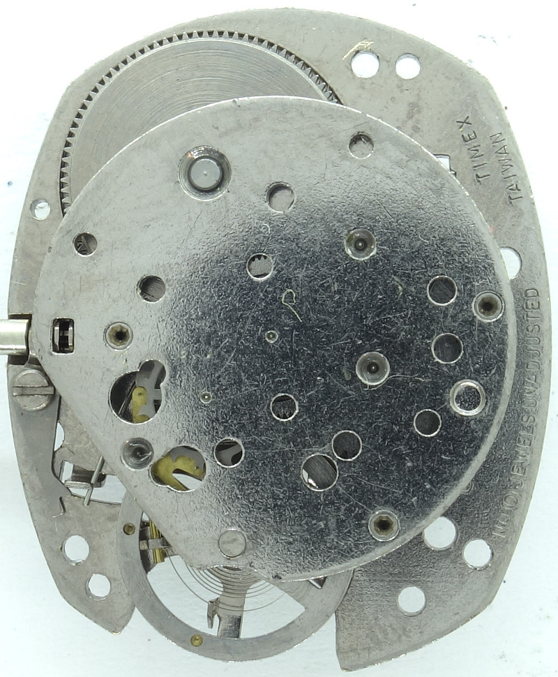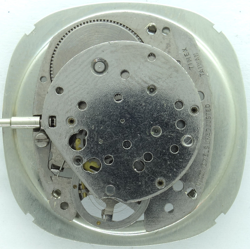 The Timex M116 specimen shown here for a larger gents’ watch has got a movement holder, onto which the metal dial is attached to.