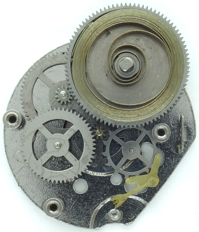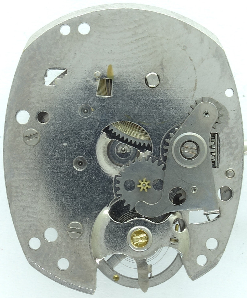 The tonneau-shaped base plate is typical for Timex. It has got no ruby bearings at all. The hairspring for the two-leg anual balance is fixated to it.