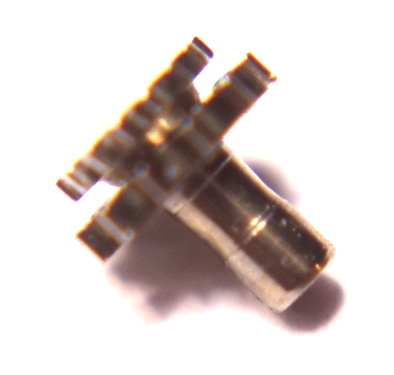 Since the hands are driven on the dial side by the mainspring barrel, the cannon pinion is a double one. Its inner/lower part engages with the mainspring barrel, the outer/upper is attached with a slipping clutch, carries the minute hand and drives the changer wheel.
