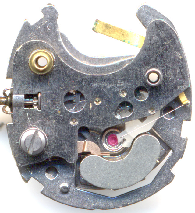 The left copper lever hacks the balance wheel when the crown is drawn into the setting position. The right, very thing straight spring is used for partially supplying the balance coil with power, so that it pushes off the balance from the permanent magnet, visible at 6 o’clock.