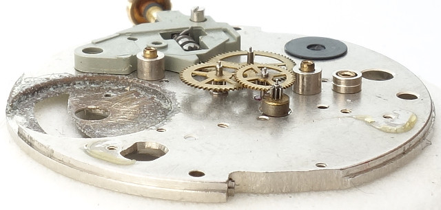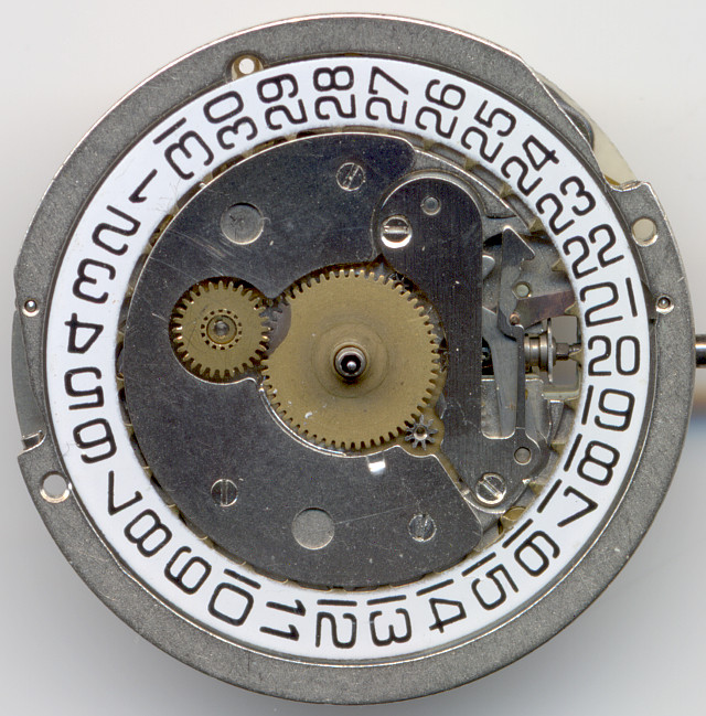 The gear train consists of a rotor (rotating magnet), a transmission wheel, the center second wheel and the third wheel, which drives the hands on the dial side.