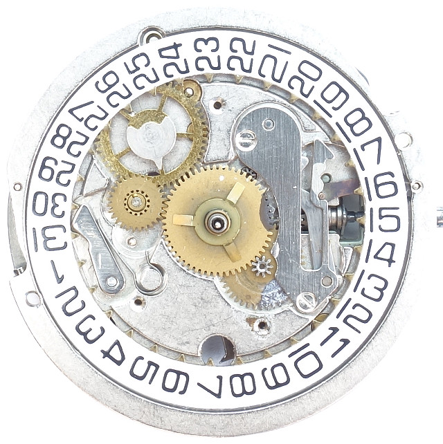 At 3 o’clock you see the yoke keyless works. In the middle crown position, the date corrector engages with the teeth of the date ring and advances or turns it backwards.