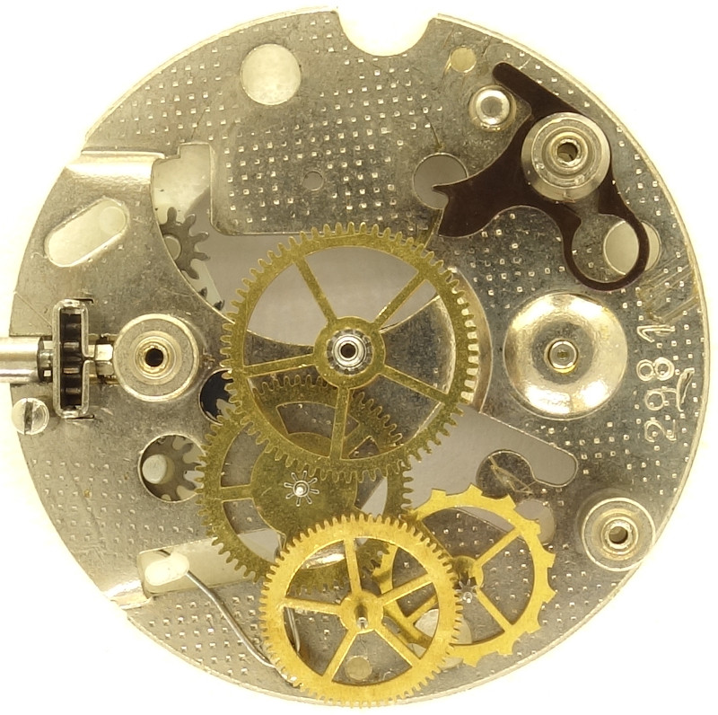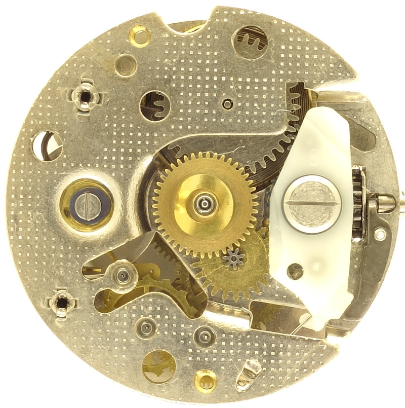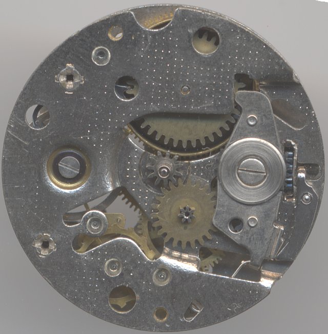 The base plate is stamped and a little higher in the middle. There are no bearing jewels on this pillar construction. At position 1 o’clock, you can see the ratchet, which is its own spring at the same time.