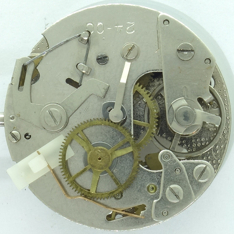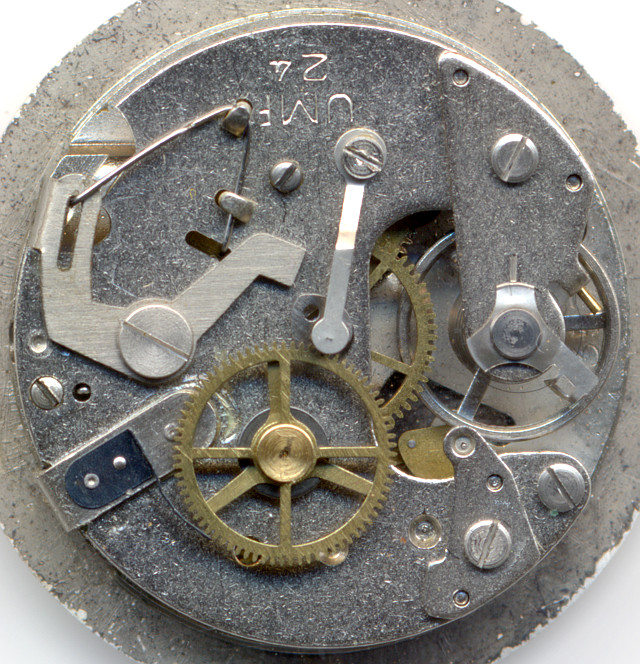 The engineers of the UMF in Ruhla, who should supply the movements, were not happy with that “fake”, so decided to construct a simple, but efficient chronograph mechanism for the UMF 24, and this was the caliber UMF 24-35 shown here.