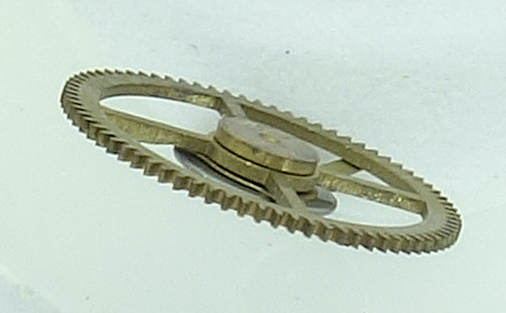 The movement-side pivot of the third wheel is prolonged, as it serves to drive the indirect center seconds hand, whose pinion has got a heart-shaped disc for resetting.