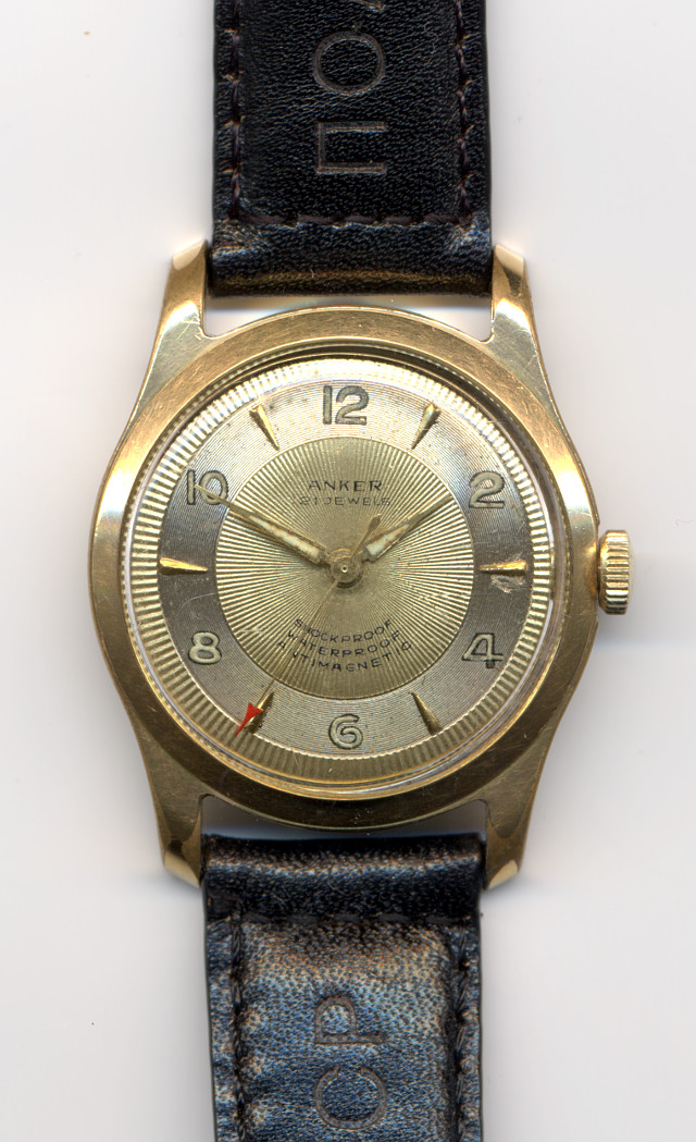 In the 1950ies, the german Vereinigte Uhrenfabriken Ersingen (VUFE), also known as Uwersi (Uhrenwerk Ersingen) launched a number of inexpensive movements of different quality. On the upper end of the scale, there was the relatively rare caliber Uwersi 57/10, which esisted in two version, which mainly differ by the number of screws of the winding bridge.
