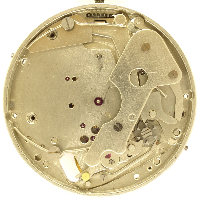 Center part is the pillar wheel at position 4 o’clock, which works with 12 steps. Each second step, the balance wheel is started with the help of a lever at 6 o’clock, and on each following step, it is stopped. This way, additional measurings are possible.