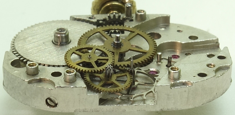 Due to the limited space, which this kind of movement offers, the dial side bearing for the seconds wheel is located half-high, above the escape wheel.