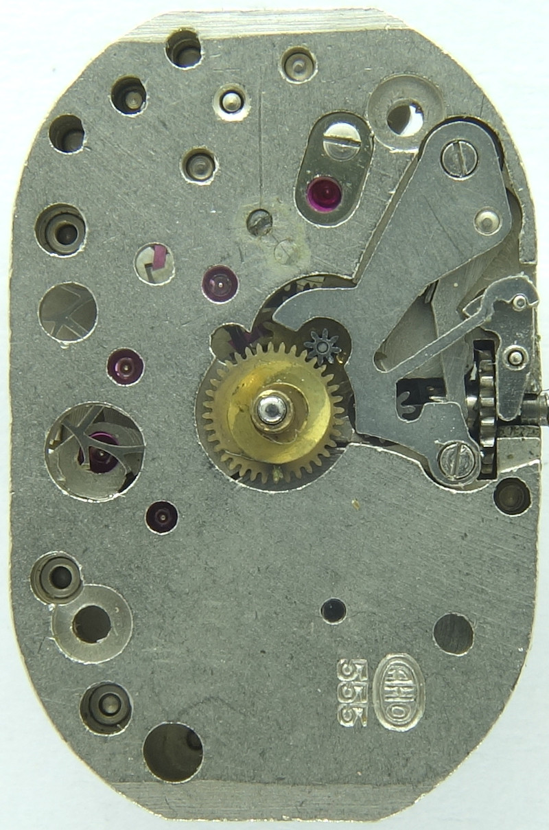 A rare specimen of the elongated 5 1/4 ligne form movements is the AHO 555 from Pforzheim im Germany, which was made around 1960.