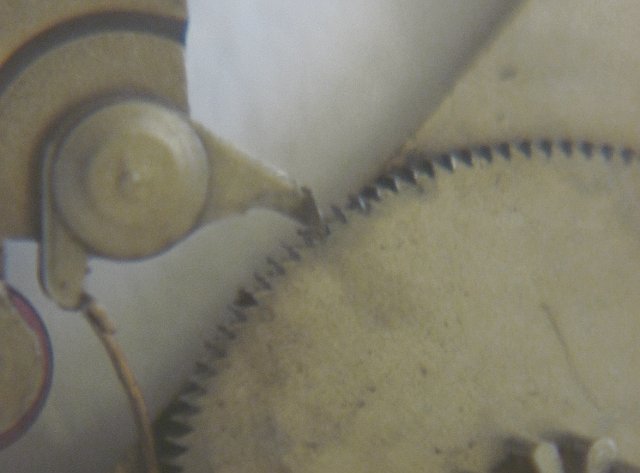 The click moves the winding wheel and decouples it on hand winding. This leads to abrasion, which can be seen on the dark spots at the tip of the click and on the gear.