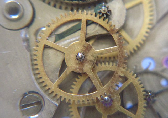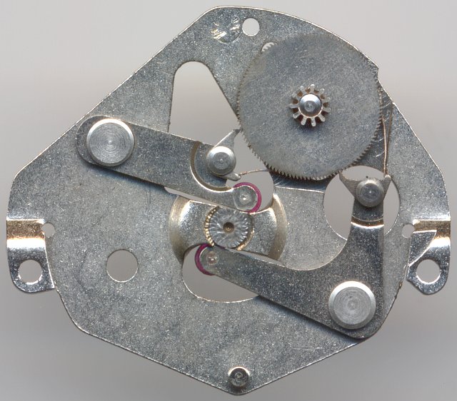 The indirectly driven center second consits of a pinion, whose number of theeth (8) is the same as the number of teeth of the fourth wheel gear (at “6”). Since both work with the third wheel, they have got the same number of rotations per minute (1).