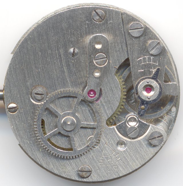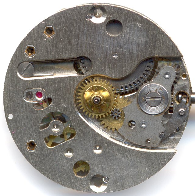 The dial side in nevertheless typical for a simple movement: The winding system is realized as rocking bar and the mainspring click is just a simple spring.