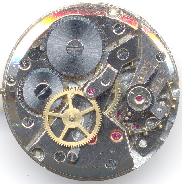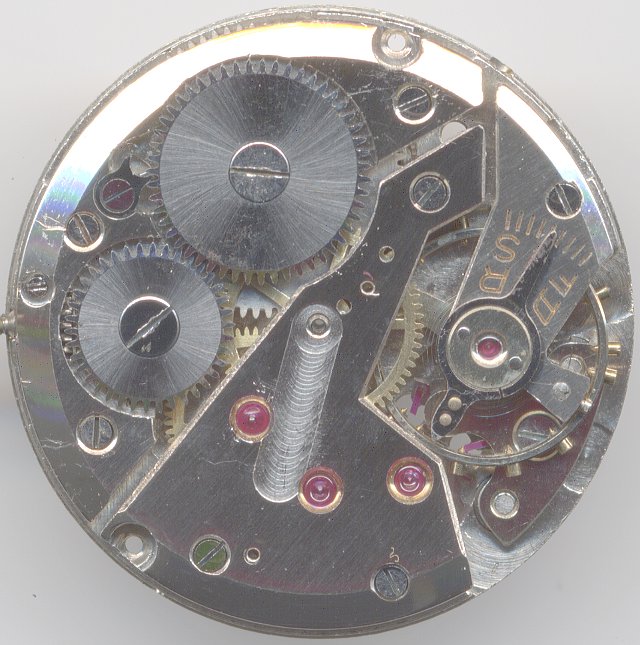 For the center second mechanism, the third wheel has got an upper wheel connected to it on the outer side of the bridge. This wheel drives the small sweep second pinion, which is located under a tiny bridge with a jewel bearing. This jewel bearing is the 16th jewel of this movement, since here, as usual on old movement, the minute wheel is not yet ruby-beared.