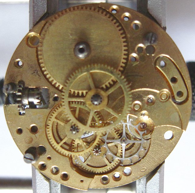 The AM 617 is one of the few small cylinder movements, which already used a yoke winding system. This is remarkable, since it means, that a rather cheap movement got a rather expensive winding system.